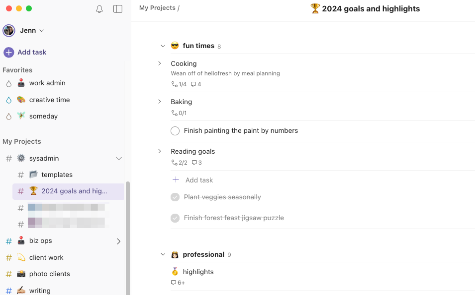 You may notice that my goals project has the same category names as my filing system. Some, like “health” and “social” got their own sections because I had more goals for each. To keep track of my annual goals, I scheduled a to-do at the end of every month to check in, which takes 10 minutes. For example, my reading goal was 24 books, two being nonfiction. Every month, I wrote in the number of books and my thoughts.
