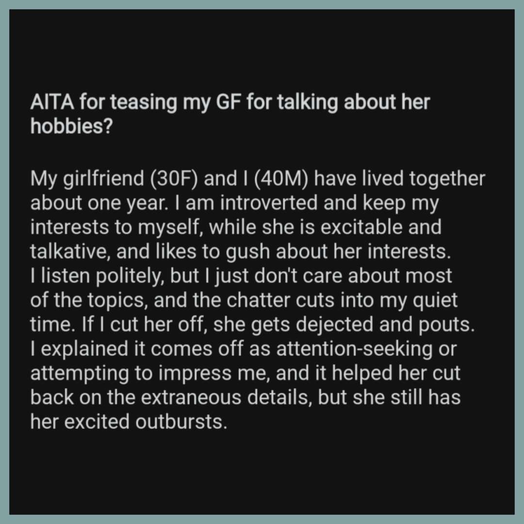 Titled “AITA for teasing my GF for talking about her hobbies,” he goes into big red flag sentences like “I explained it comes off as attention seeking” and “I teasingly (but honestly) said that at a certain age, Minecraft is a form of regression and shouldn’t be shared so proudly and openly.” In dating, one of the most attractive qualities of someone is their excitement about their hobbies. You get excited with them, even when you don’t care about the topic. Alternatively, you become an intensely boring date and I write about you.