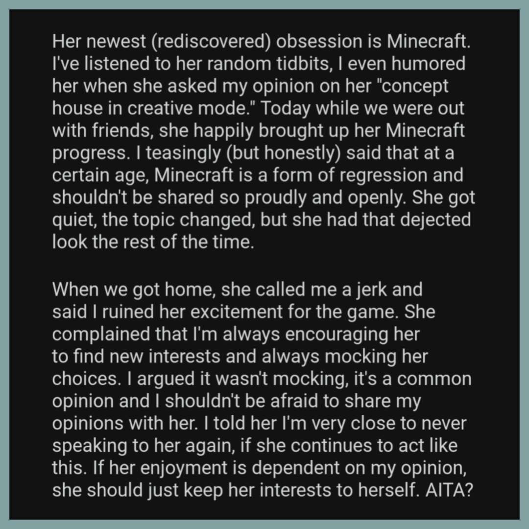 In the AITA (Am I the Asshole) Reddit sub, a man wrote about criticizing his girlfriend for talking passionately about Minecraft in conversations. The original post was deleted, but it got screen-capped on Twitter.
