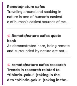 what one article’s set of notes looks like More research: I go back to research studies and journals and pull quotes from those. This gets compiled into a research note. Both the quote bank and the research studies live in what Ulysses calls “material sheets.” I link these up with the article draft.